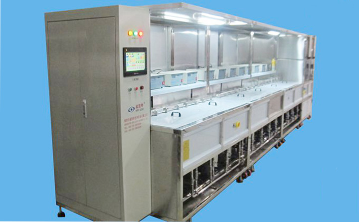 整個清洗工藝由人工手動控制模式完成,共有6個超聲波清洗工位、1個純水漂洗槽、1個慢拉脫水槽、2個熱風烘干槽組成。