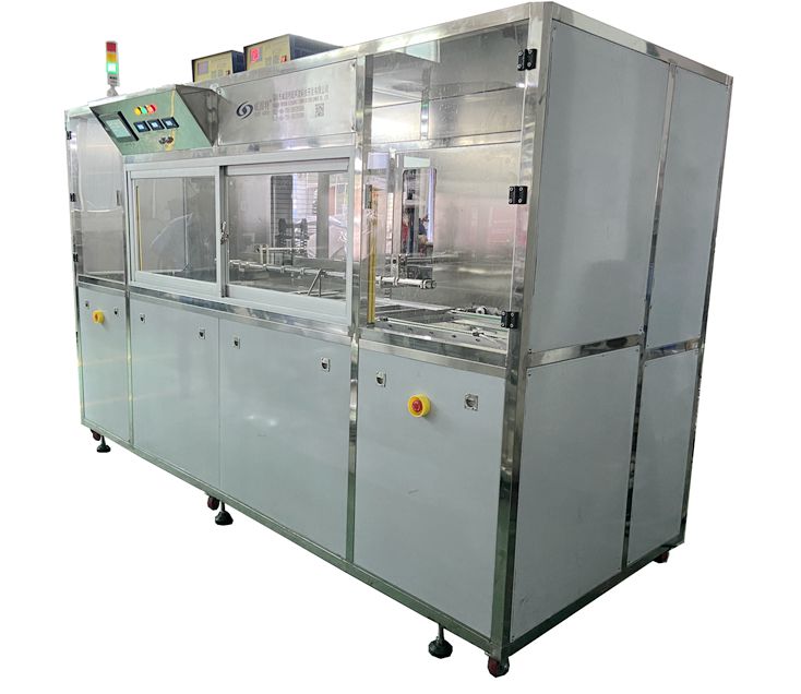 人工上料→自動(dòng)上料→1 超聲浸泡酸洗→2 噴淋漂洗→3 超聲純水漂洗(拋動(dòng))→4 超聲純水漂洗(拋動(dòng))→5 超聲純水漂洗→自動(dòng)下料→人工下料。